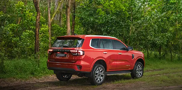 LED tail lamps set in a full-width design emphasize Everest’s increased track. The extra width plants the vehicle on its wheel creating a strong and muscular offset to the glasshouse.